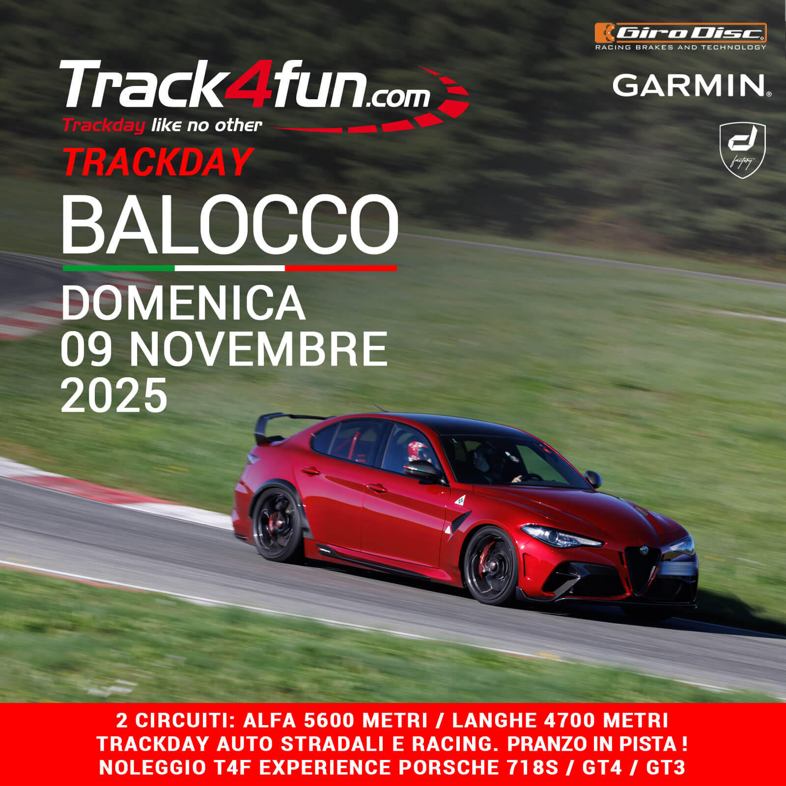 Lo storico e veloce ALFA ROMEO TRACK con i suoi 5,6 km e il più tortuoso circuito LANGHE da 4,7 km ci ospiteranno per un bellissimo Trackday.